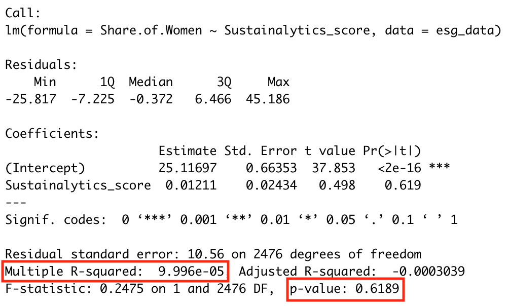 Assuming a significance level of 0.05, the Share of Women is just so below that threshold, meaning the variable has a slight impact on the dependent variable, the ESG score.