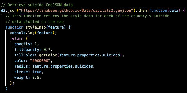 I also adapted this GeoJSON dataset, which includes the coordinates of world capitals, to include suicide rates for the countries in my dataset. I hosted my own GeoJSON dataset via GitHub Pages to be able to make API requests to it.